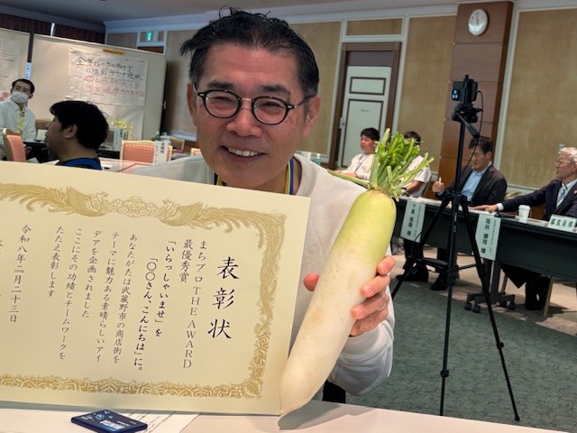 2月23日、武蔵境スイングホールで開催された「第二回まちプロTHE AWARD」で、武蔵野市市長から最優秀賞として表彰されました。このプロジェクトは、市の産業振興課が主催した、市内にある44の商店街の活性化を目指した市民参加の活動です。15チームから選抜された3チームが、市長、商店会長、商工会議所会頭、一般参加の市民の方々の投票から選出されました。当日の大根を持った白熱した演出の効果(笑)もあり受賞となりました。今後は、今秋までに活動予算を策定し、来年から本格的な活動を開始します。(受賞したテーマについては、別途お話します!!)